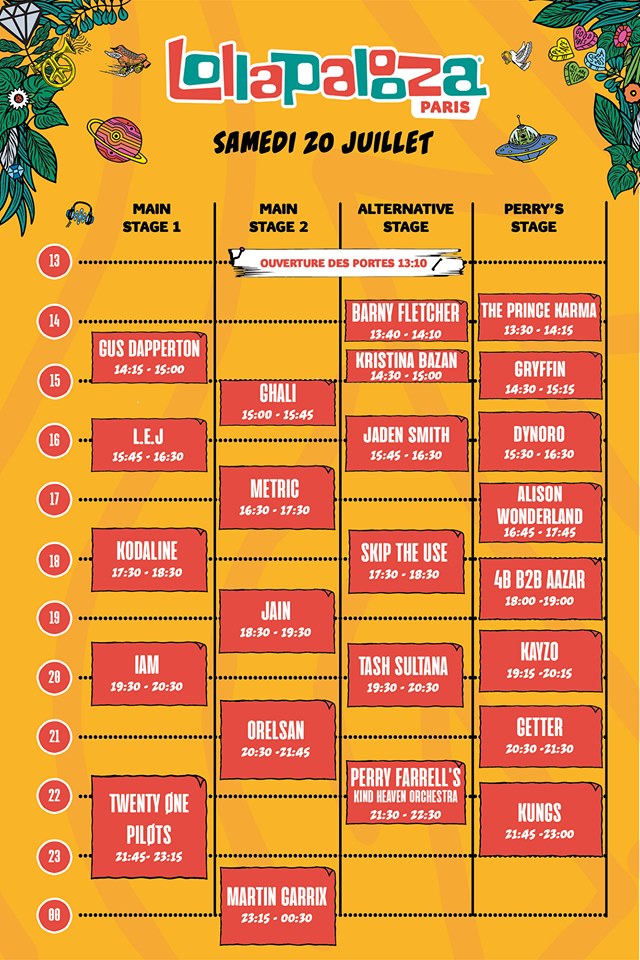 Jour 1 : ORELSAN / JAIN / IAM / SKIP THE USE / MARTIN GARRIX / TWENTY ONE PILOTS / L.E.J (LEJ) / TASH SULTANA / KUNGS / JADEN SMITH / KODALINE /METRIC / GUS DAPPERTON / GRYFFIN / PERRY FARRELL’S KIND HEAVEN ORCHESTRA / KAYZO /DYNORO / ALISON WONDERLAND / KRISTINA BAZAN / GETTER